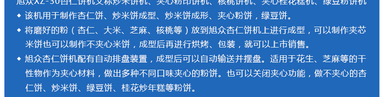 XZ-30杏仁餅機,該機用于制作杏仁餅、炒米餅成型、炒米餅成形、夾心粉餅,綠豆餅。