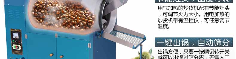 3.用氣加熱的炒貨機(jī)配有節(jié)能灶頭,可調(diào)節(jié)火力大小。用電加熱的炒貨機(jī)帶有溫控儀,可任意調(diào)節(jié)溫度。