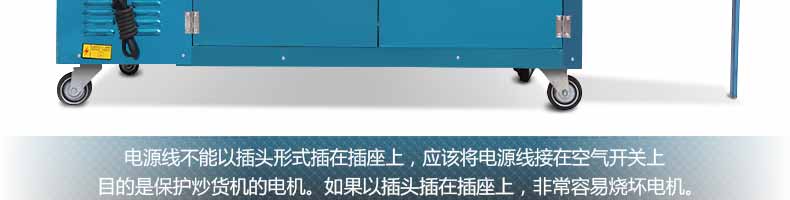 電源線不能以插頭形式插在插座上,應(yīng)該將電源線接在空氣開(kāi)關(guān)上,目的是保護(hù)炒貨機(jī)的電機(jī)。如果以插頭插在插座上,非常容易燒壞電機(jī)。