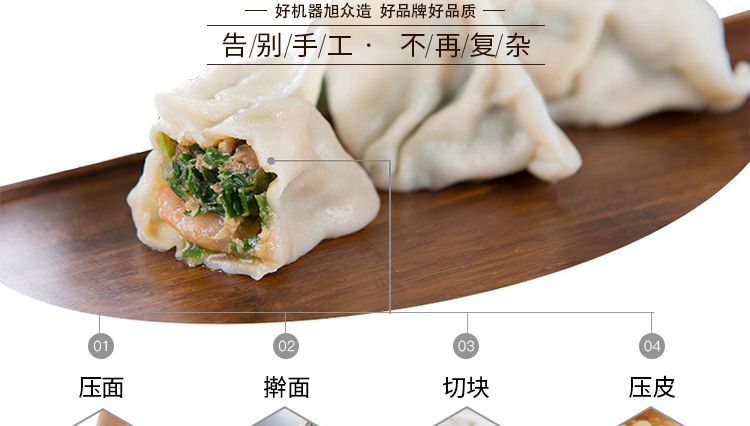 本機具有高效節(jié)能、安全衛(wèi)生、無邊角廢料、大小厚薄可定制等優(yōu)點,使所生產(chǎn)餃子皮在外觀、口感、重量達(dá)到空間統(tǒng)一,從而轉(zhuǎn)變了當(dāng)今生產(chǎn)效率低、員工揮霍、二次污染、中部缺口等現(xiàn)狀,該仿手工餃子皮機除具有以上優(yōu)點外,還可依據(jù)生產(chǎn)必要轉(zhuǎn)變出皮速度等優(yōu)點。