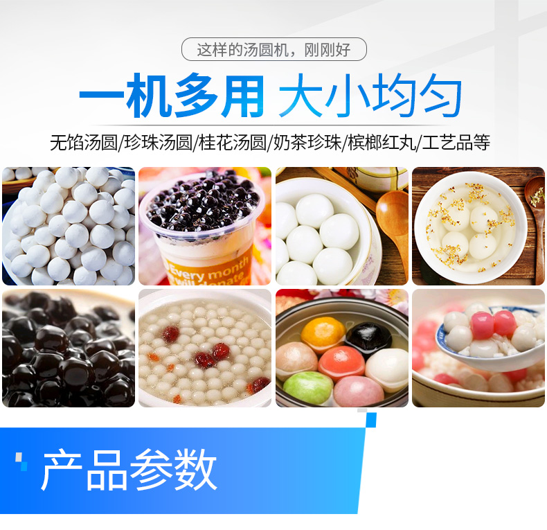 ? 本機(jī)可生產(chǎn):無(wú)餡湯圓、珍珠湯圓、桂花湯圓、奶茶所用的珍珠、檳榔紅丸、工藝品等。