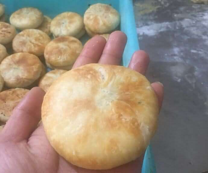 酥餅(Crispy Cakes ),系有特制的脂烙酥而得名。脂烙酥用上好的豬油,拌以適量蒸好的面粉,化油時(shí)加適量花椒、桂皮,油化后剔出已炸酥的花椒、桂皮,再和面成餡?;馃び孟阌秃兔?,包制好入爐,用文火烘烤而成。其特點(diǎn)是皮酥,瓤有異香而不膩。