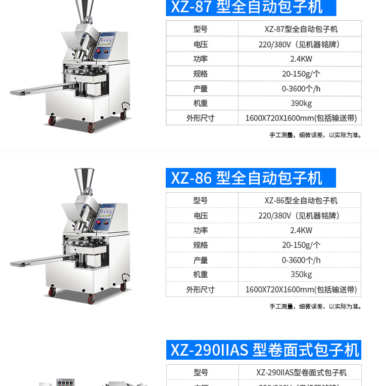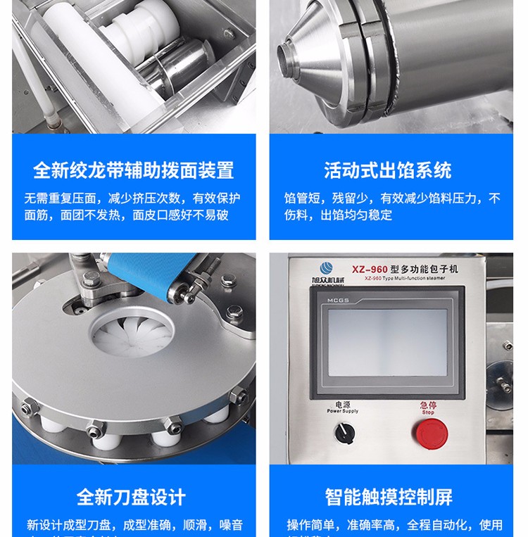 XZ-960多功能包子機(jī)采用新設(shè)計出面系統(tǒng),帶有輔助撥面裝置投面后無需重復(fù)使用手壓面/推面,有效提高工作效率/預(yù)防安全隱患;絞龍采用新概念,減少擠壓次數(shù),有效保護(hù)面筋、面團(tuán)不發(fā)熱,保證面皮的口感;做湯包時,皮可更薄,面皮里外更光滑(可當(dāng)氣球吹大)有效保護(hù)餡料里面的湯汁不會漏出或被吸收;出面斗帶有自動恒溫制冷系統(tǒng)最低溫度可達(dá)2℃ ,冷媒:R134A(特殊要求可按要求定制)(若定制,貨期增加20天工作日);操作簡單易懂,拆裝簡單,清洗方便;適合產(chǎn)品范圍:湯包,小龍包,速凍包,生煎包,發(fā)面包子,各類餡料包子等產(chǎn)品