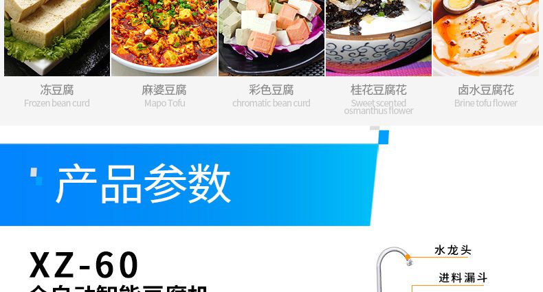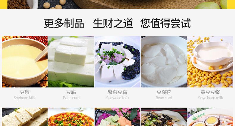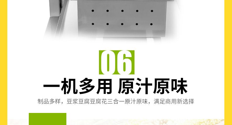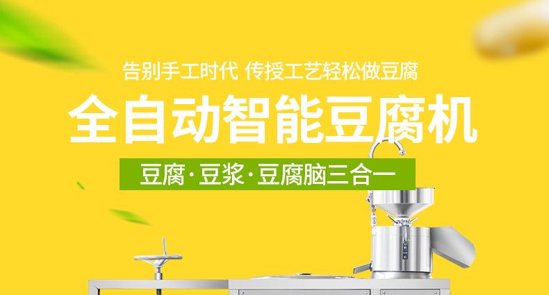 全自動(dòng)豆腐機(jī)系列,一機(jī)多用:可生產(chǎn)豆腐系列產(chǎn)品:?jiǎn)紊?,老)豆腐、多彩?腐、單色豆腐皮、多色豆腐皮、彩色豆腐干、豆?jié){、豆花等豆制品制作,還可以與其他設(shè)備和工藝配套生 產(chǎn)更多的豆制品。