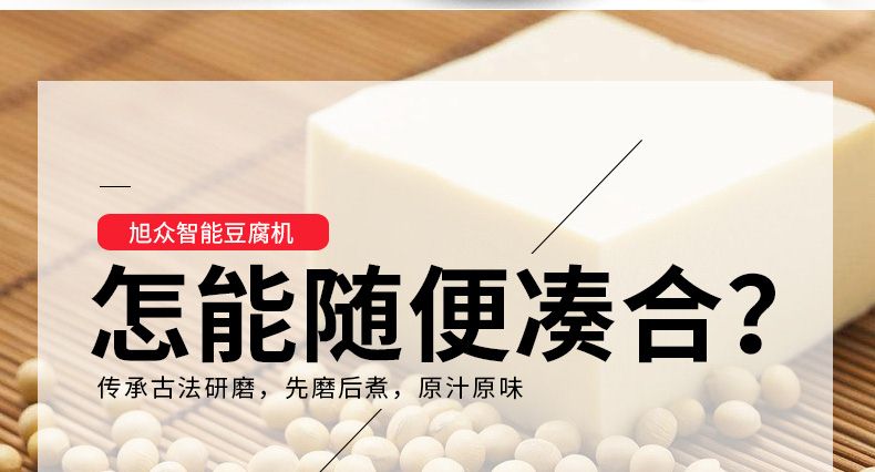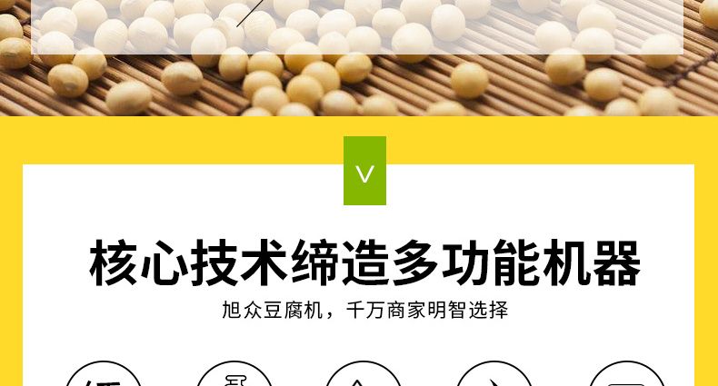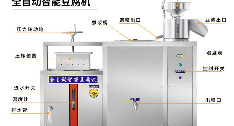 旭眾智能豆腐機(jī)專業(yè)生產(chǎn)數(shù)種豆?jié){制品,穩(wěn)定高效,采用磨漿分離機(jī)和煮漿機(jī),出品率高于其它設(shè)備,擁有自動(dòng)控制系統(tǒng),還增加數(shù)碼溫度控制儀,對(duì)煮漿隨時(shí)進(jìn)行監(jiān)控,同時(shí)對(duì)不同產(chǎn)品所需溫度自行設(shè)定,當(dāng)煮漿達(dá)到設(shè)定溫度時(shí),具有自動(dòng)提示及報(bào)警功能;整機(jī)采用不銹鋼材質(zhì)制作,質(zhì)量卓越,占地面積小,安裝簡(jiǎn)單,工藝先進(jìn),一臺(tái)設(shè)備只需一人操作,省時(shí)、省力、省工。