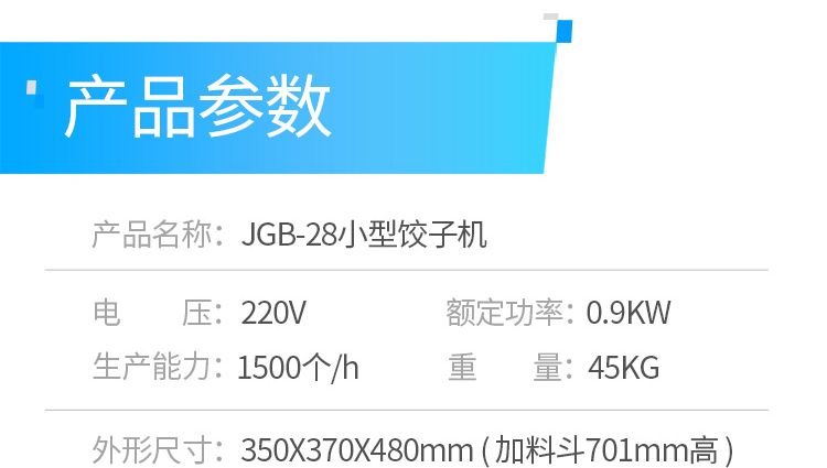 名稱JGB-28型小型餃子機 電源220V 功率65W 產量0-1500個/h 尺寸350×370×700mm(加料斗) 重量45kg 規格 其他