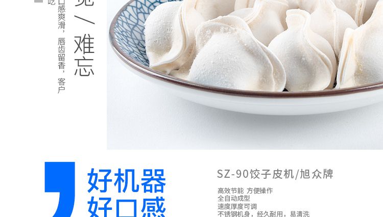 JGB-90型餃子皮機(jī)是我公司開發(fā)生產(chǎn)的先進(jìn)餃子皮生產(chǎn)設(shè)備。可以簡(jiǎn)單更換模具(可根據(jù)客戶定制不同形狀、尺寸的模具),本設(shè)備采用氣缸運(yùn)動(dòng)。本廠生產(chǎn)的90餃子皮機(jī),采用多道壓面輥壓面,壓面效果優(yōu)異,壓出的面皮筋道,進(jìn)一步提高所包出的餃子口感。