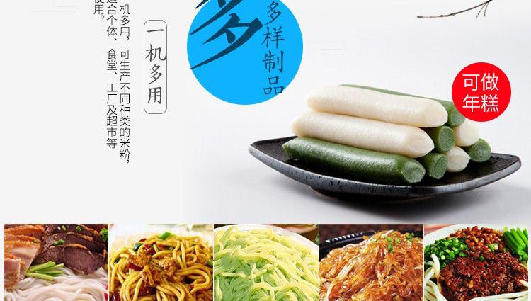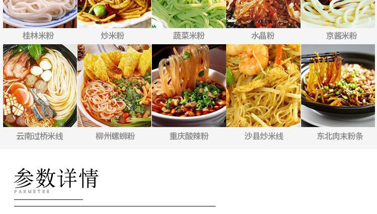 ◆ 米粉機生產(chǎn)多樣性可生產(chǎn)米粉、米線、粉絲、粉條、年糕、玉米面條、各種雜糧粉絲、各種面條、雜糧面條、彩色面條以及以紅薯、玉米、大豆、蠶豆等制成淀粉為原料的等多種食品而且每種食品厚薄、粗細(xì)等規(guī)格可根據(jù)需要任意調(diào)整。