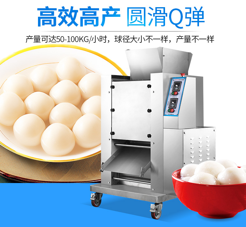 ? 本機(jī)速度高,每小時(shí)可生產(chǎn)0-120kg湯圓,球徑大小不一樣,產(chǎn)量不一樣。