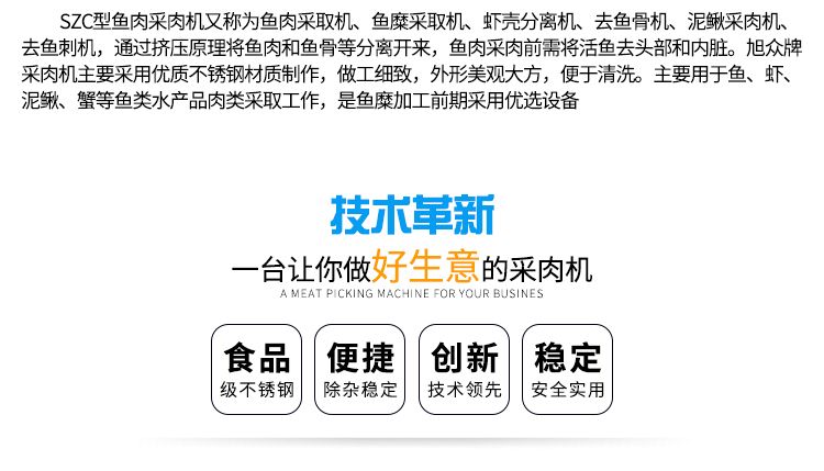 旭眾XZC系類魚肉采肉機(jī)是一款專業(yè)加工魚肉去刺、蟹蝦去殼的機(jī)械,由于隨著市場(chǎng)的發(fā)展,人們生活中漸漸離不開有魚的生活,無論是家里、飯店等魚都是主要的食物還有現(xiàn)在一些休閑食品中都是離不開魚加工后的魚泥。魚肉采肉機(jī)的研制成功給人們生活中帶來很多方便,無論是您做魚丸、魚餡等只需要一款魚肉采肉機(jī)就可以實(shí)現(xiàn),對(duì)于大量生產(chǎn)即降低了人工成本,又提高了生產(chǎn)效率。