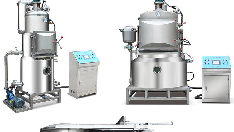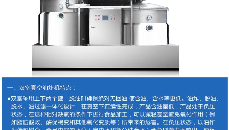 ●雙室采用上下兩個罐,脫油時確保絕對無回油,使含油、含水率更低。油炸、脫油、脫水、油過濾一體化設(shè)計,在真空下連續(xù)性完成,產(chǎn)品含油量低,產(chǎn)品處于負(fù)壓狀態(tài),在這種相對缺氧的條件下進行食品加工,可以減輕甚至避免氧化作用(例如脂肪酸敗、酶促褐變和其他氧化變質(zhì)等)所帶來的危害。在負(fù)壓狀態(tài),以油作為傳熱媒介,食品內(nèi)部的水分(自由水和部分結(jié)合水)會急劇蒸發(fā)而噴出,使組織形成疏松多孔的結(jié)構(gòu)。
