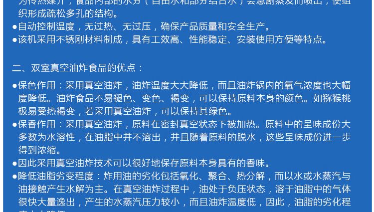 ●真空油炸是在低溫(80~120℃)對食品進行油炸、脫水,可以有效地減少高溫對食品營養(yǎng)成分的破壞。